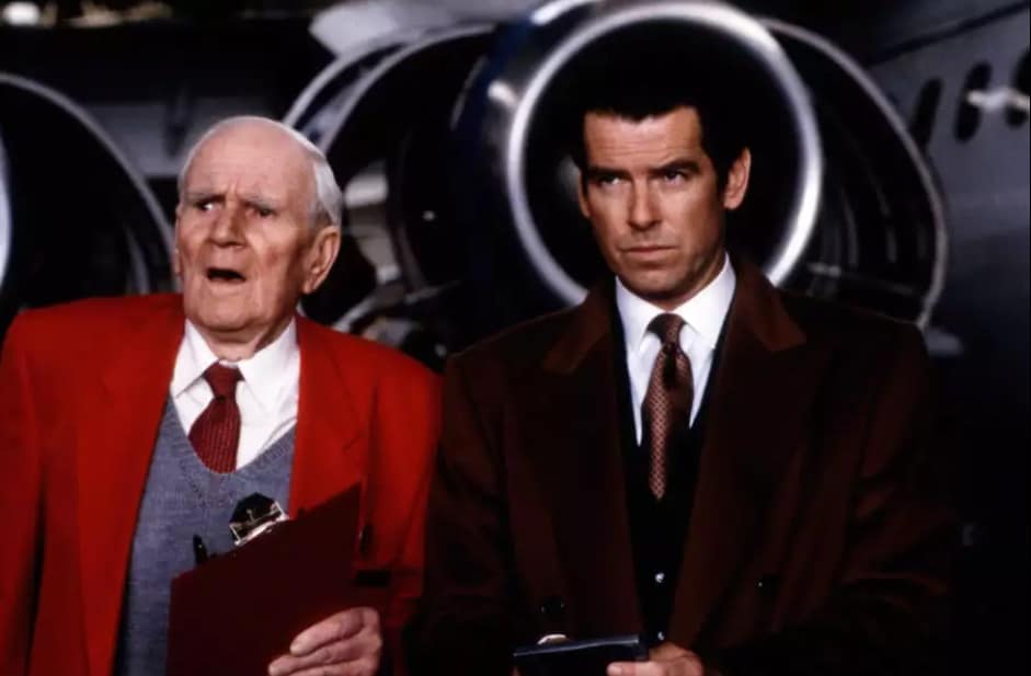 Desmond Llewelyn jako Q w „Jutro nie umiera nigdy”, kadr z filmuLlewelyn szykował się do emerytury – jego postać w filmie Świat to za mało z 1999 roku wybiera się już na emeryturę i przedstawia Bondowi swojego następcę, granego przez Johna Cleese (tak, tego od Monty Pythona). Bond żartobliwie nazywał go R i pomimo, iż w rolę tę wcielał się tylko w dwóch filmach, przeszedł ścieżkę od gapowatego asystenta po pełnoprawnego następcę.