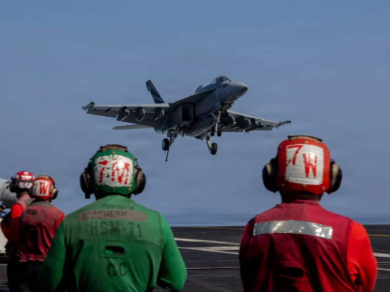 Zdjęcie: Amerykański samolot F/A-18E Super Hornet podczas lądowania na lotniskowcu USS Abraham Lincoln Źródło: Wikimedia Commons