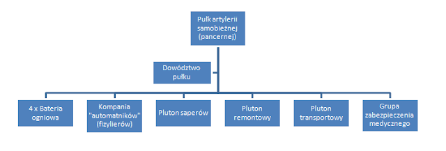 Издание самоходного артиллерийского полка No 010/462 (в народе польская армия называлась бронетанковым артиллерийским полком) насчитывало 318 солдат и 21 среднеразмерное самоходное орудие.