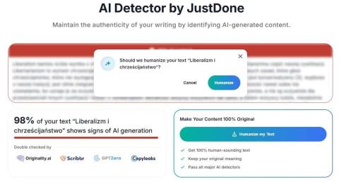 Tekst, który napisałem w 2014 roku, detektor sztucznej inteligencji uznał za napisany przez sztuczną inteligencję w 98%. I zaproponował, iż może mi go zhumanizować, a zatem przerobić na taki, iż on sam uzna, iż tego nie napisała sztuczna inteligencja. Detektory AI głównie po takich cechach rozpoznają teksty napisane przez AI: